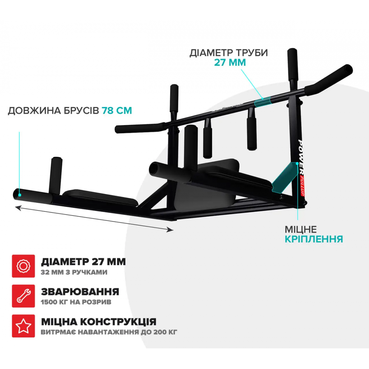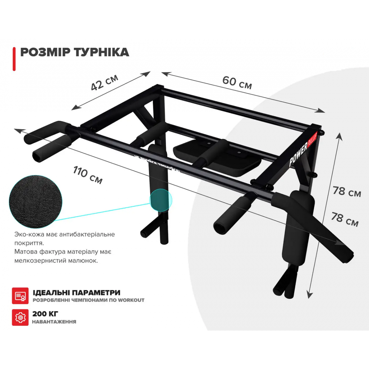 | Размер | Длина перекладины 110 см. Вылет от стены 42 см. Высота крепления 26 см. Ширина между креплениями 55 см. Вынос брусьев от стены 76 см. |